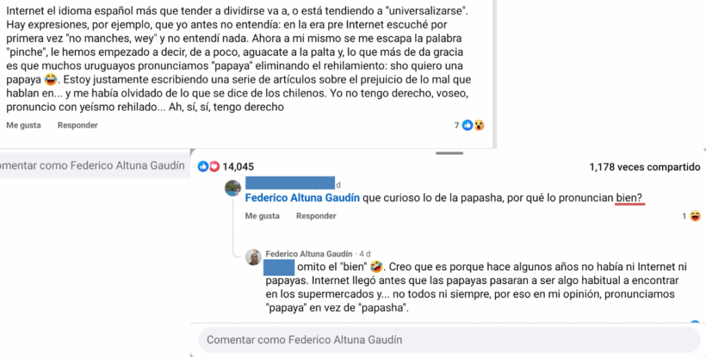 Es un intercambio real. Son capturas de pantalla de mi perfil de Facebook, sí, Federico Altuna Gaudín soy yo. Cubrí el nombre de la persona que me hizo el comentario porque se nota que no lo hizo con malicia, sino por curiosidad, porque mi idea en este blog es compartir mi idioma y mi cultura y no molestar a nadie, y porque yo sé que esta es la realidad: incluso muchas personas que hablan mi variante del idioma piensan que hablamos mal. Yo mismo lo pensaba, hasta que empecé a ahondar en los idiomas, y empecé a aprender mi propia lengua, y pude entender que en lingüística, en realidad, es muy difícil aseverar que algo está mal. Porque uno habla como se habla donde uno vive. Y en fonética esto es más difícil aún, según mi punto de vista. Si yo mañana dejara de pronunciar con rehilamiento las y y las ll viviendo en mi país nadie me diría que he mejorado mi español, no, por el contrario, me harían burla seguramente. Porque nosotros hablamos así, es nuestra variedad del idioma y, si yo intentara modificarla para sonar más “neutro” estaría haciendo algo artificial. Algo falso.